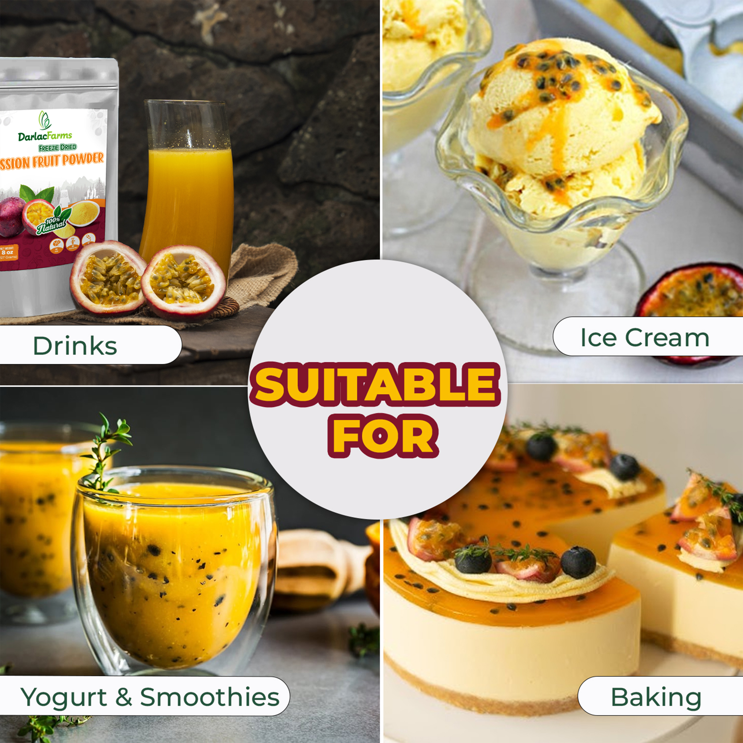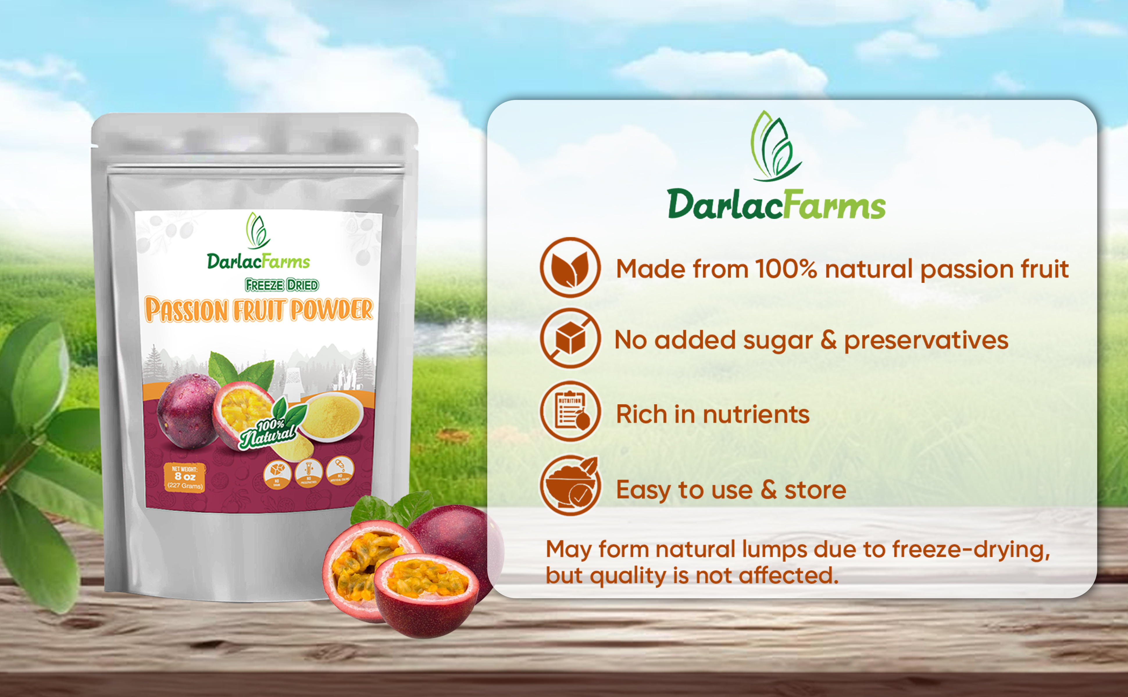 Bột chanh dây sấy thăng hoa được sản xuất từ những trái chanh dây chín tự nhiên, tuyển chọn kỹ lưỡng và xử lý bằng công nghệ sấy thăng hoa hiện đại. Quy trình này giúp giữ trọn hương vị chua ngọt đặc trưng, màu sắc tự nhiên cùng các dưỡng chất quý giá như vitamin C, chất chống oxy hóa và khoáng chất. Sản phẩm có kết cấu mịn, dễ hòa tan, phù hợp cho ngành thực phẩm, đồ uống, dinh dưỡng và mỹ phẩm thiên nhiên.